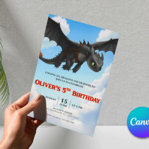 Create an exciting and magical birthday invitation with this Dragon Toothless Birthday Invitation Canva Template! Inspired by the beloved Toothless dragon, this digital invitation is perfect for kids who love dragons, adventure, and fantasy themed parties.