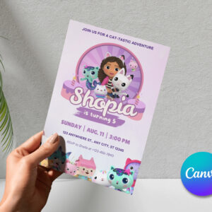 Create a magical and adorable birthday invitation with this Gabby’s Dollhouse Birthday Invitation Canva Template! Designed with a cute and colorful dollhouse theme, this digital invitation is perfect for kids who love cats, dolls, and playful adventures.